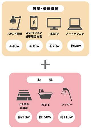 冷蔵庫、照明、テレビ、携帯電話充電、ノートパソコンなど